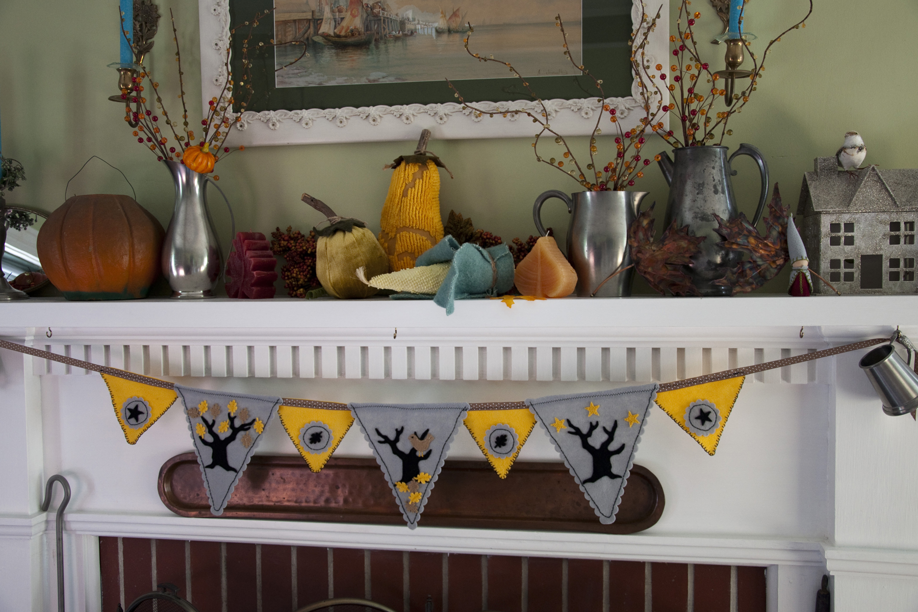 And the fall banner for the mantel. It was time for a new one, and this one seemingly appeared from the netherworld. Really. I just sat down one day and started and then it was done. That is my favorite kind of project.