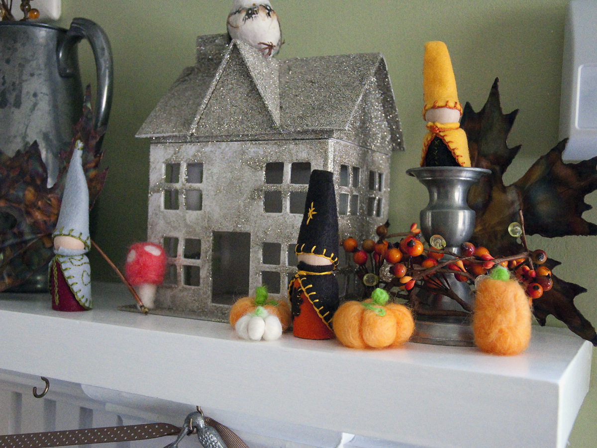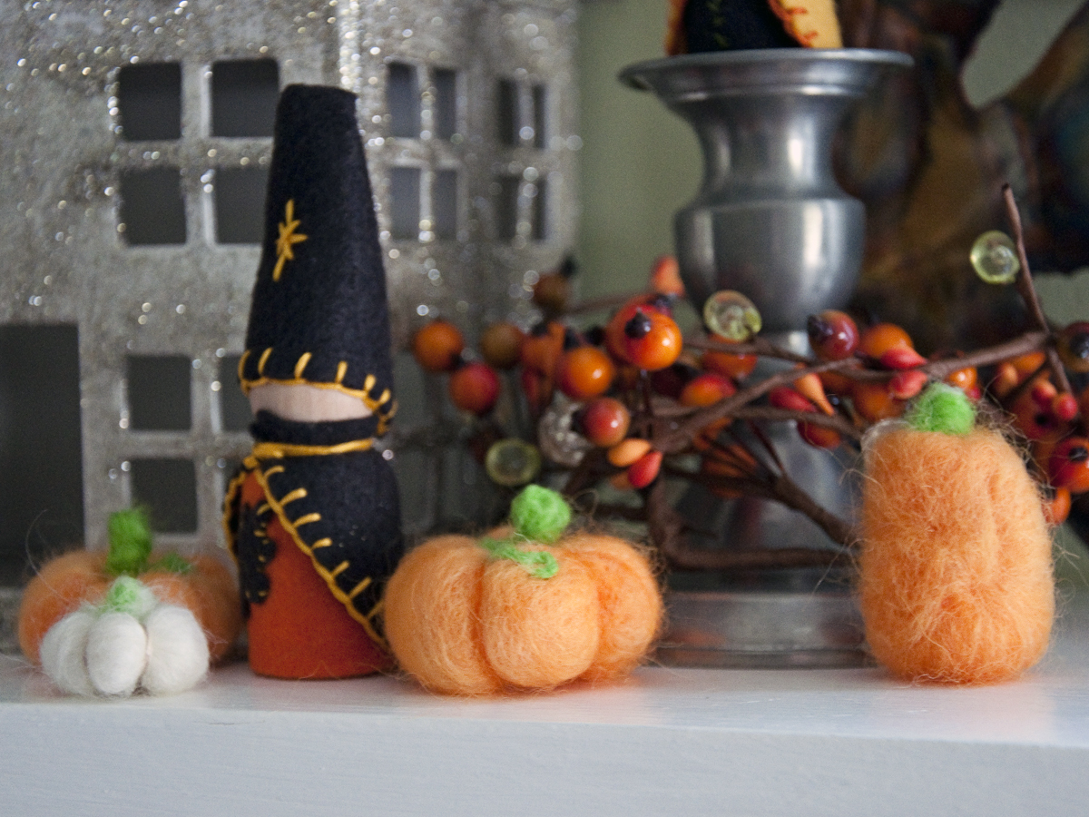 Those needle-felted pumpkins make me so happy, I can’t stand it. I found wool roving at the Yankee Peddler this year, dyed it with Kool Aid, and poked the life out of my fingers until I got the hang of it.