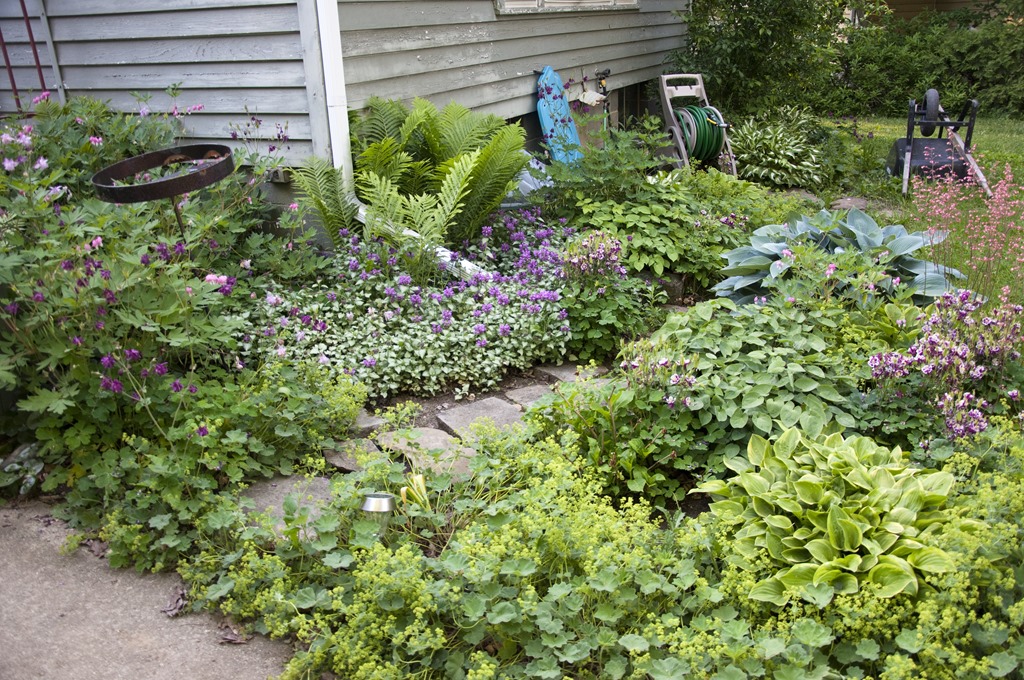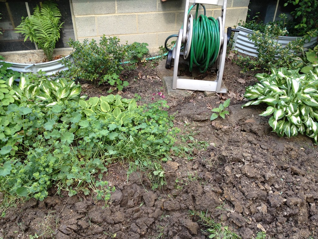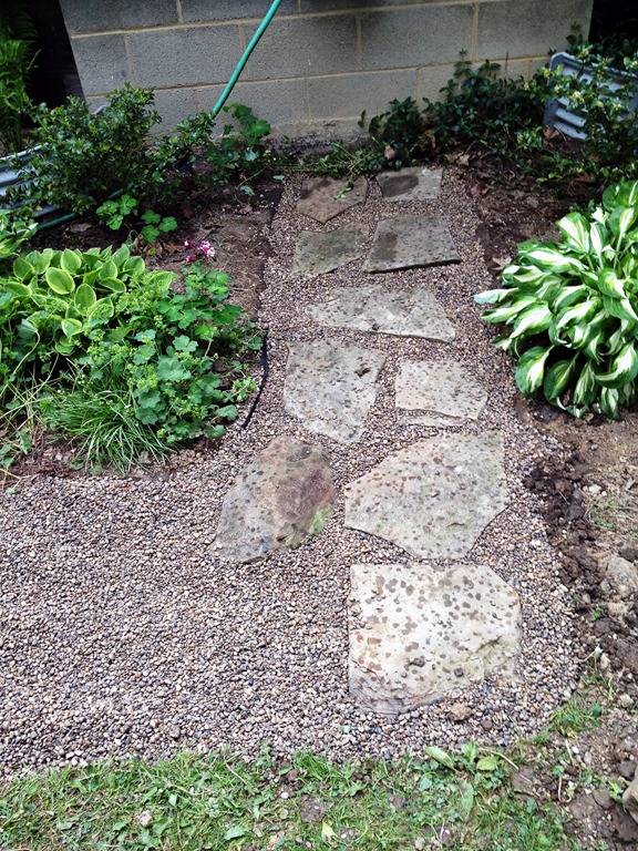 And from here, it doesn’t look so bad. But every single spring, I have had to pull up every single stone and pull weeds and rein in the dead nettle and lady’s mantle, and I had stolen some of the stones to use up front in the veg garden, and the part over by the hose was just too horrible for words.