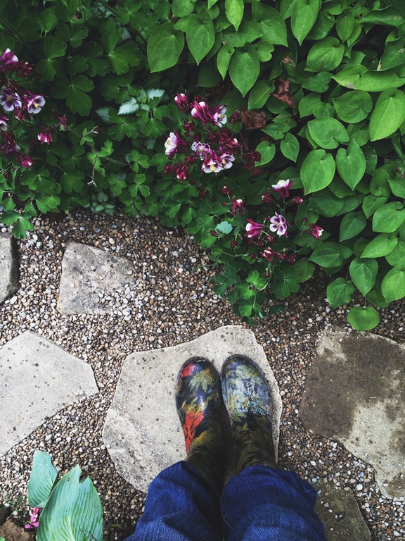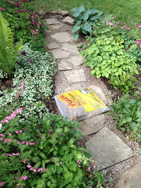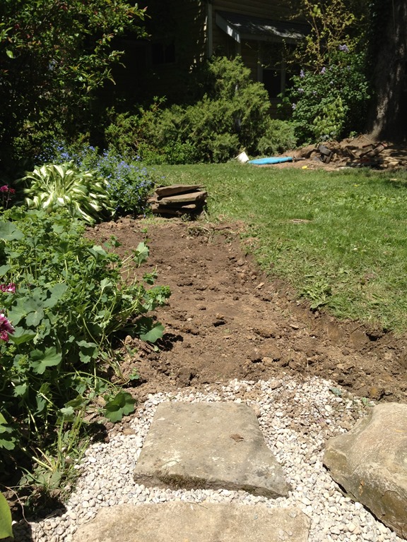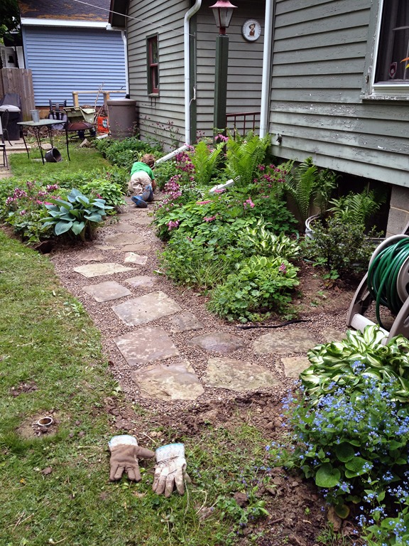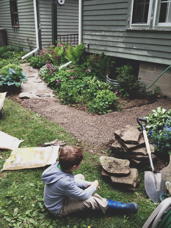 We solved a huge problem in our back yard this week. I was so DONE with the “flower bed” behind the house that I was ready to just spend millions of dollars building a deck over it and never seeing it again. But then, last Sunday, Chad and I had a brain wave: What if we rebuilt the most annoying part, the stone path that winds through?