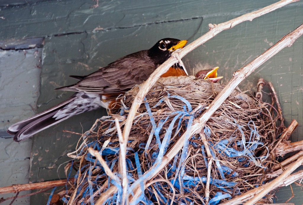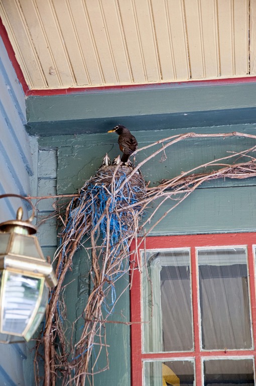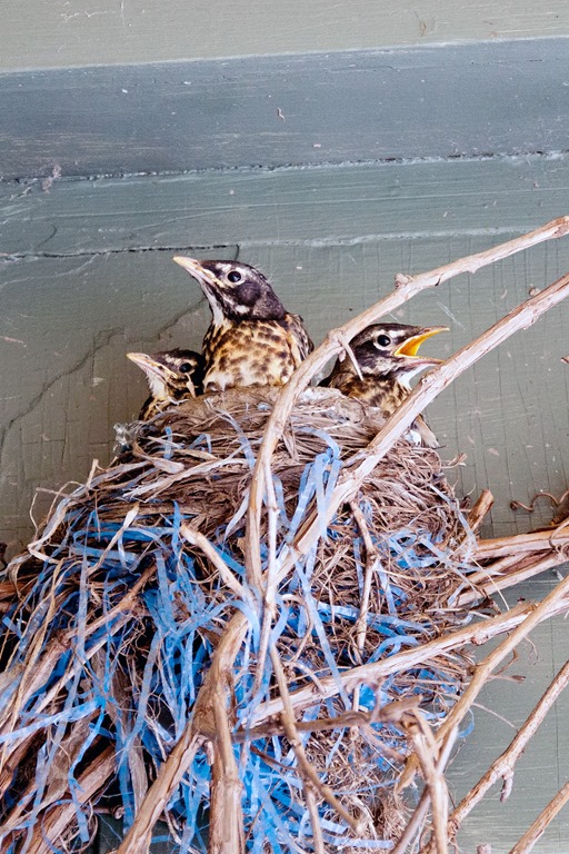 Mama and Papa robin are so very brave these days. Every time we look up there, we see these naked little beaks making yellow triangles above the edge of the nest. Sweet babies!