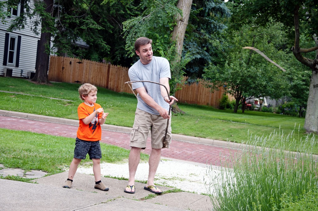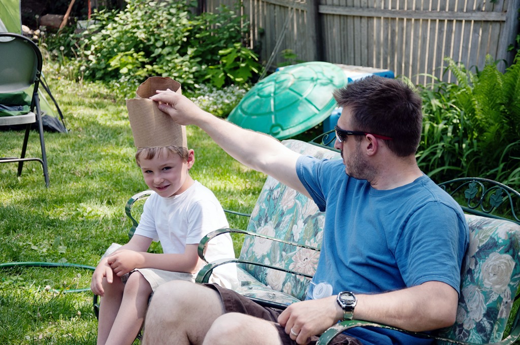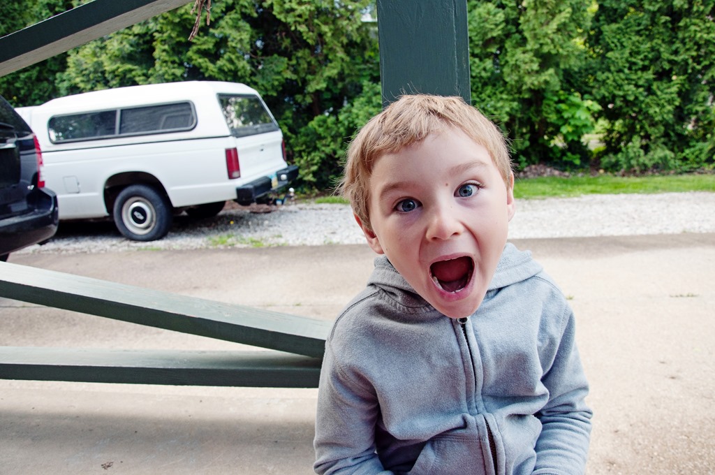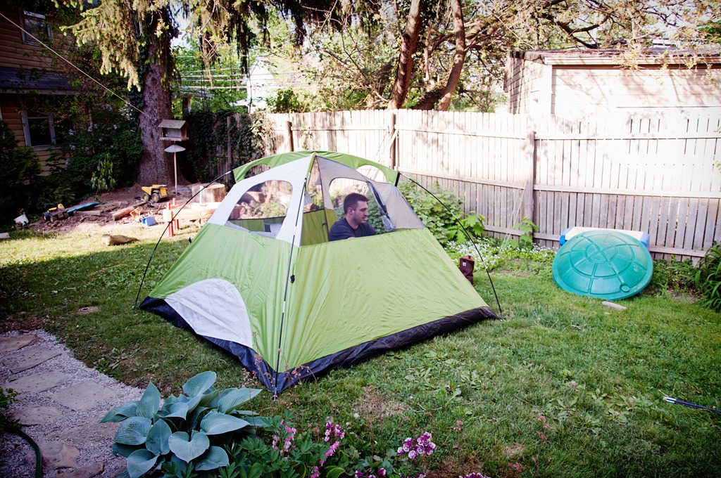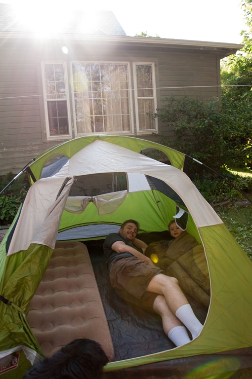 Some robins, silly birds, decided to have a big fight in the tree above the tent at dusk. A fire engine came screaming through the intersection. Someone decided to share his awesome bass with the rest of the world. It was, in a word, NOISY. Way, way too noisy. Aiden was still awake two hours past his bedtime, and the neighbor’s security light behind the house shone directly into the tent. We laughingly called it, hauled in our stuff, and went to bed in our quiet house, with fans running for white noise.