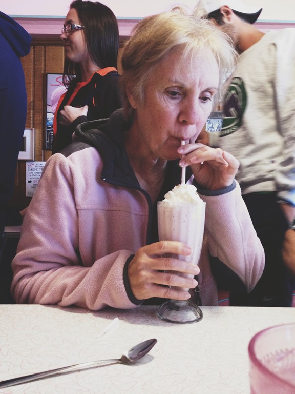 Sweet mom, enjoying her strawberry milkshake at Dan’s Dogs.