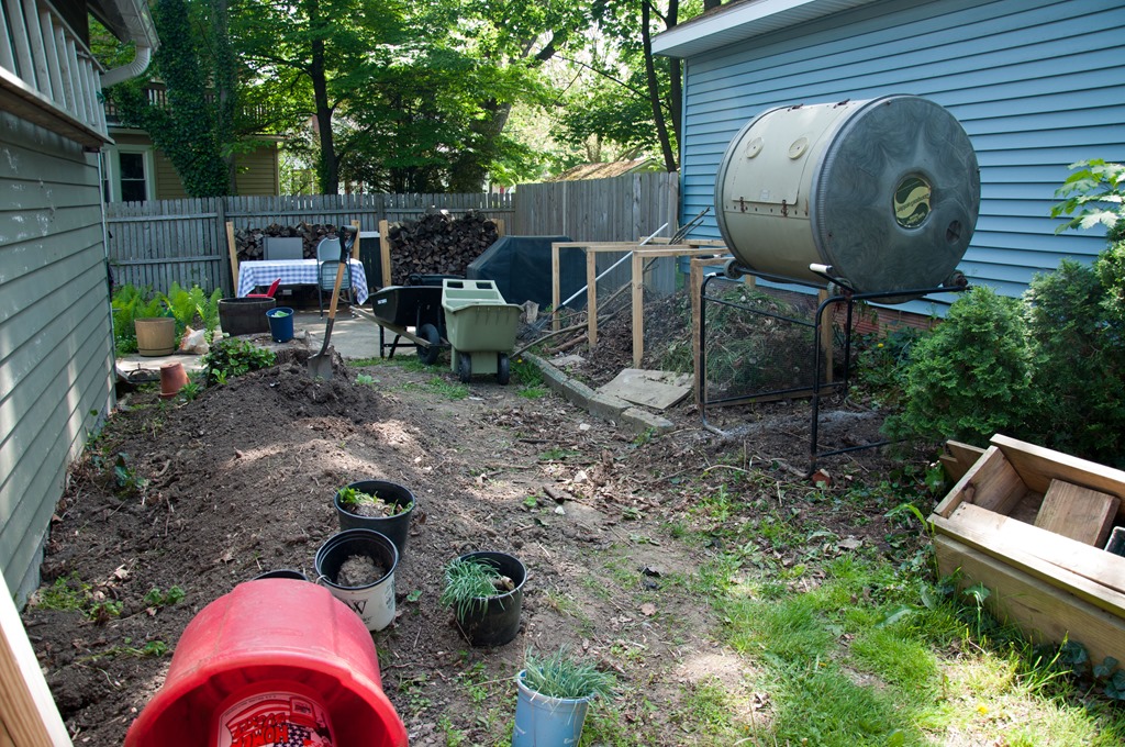 We have been working on this section of our yard for several years. We used to have a huge maple tree here that was slowly dying and dropping branches through the roof and into the yard. Finally, two years ago, we had it taken down and sawn into huge chunks, all of which were left strewn about. I had been using this area for my composting as well. My ten years of composting. That’s a lot of compost. Last fall, we built the three-bin compost system, and we have slowly been transitioning from big random piles to small, not-so-random piles. The plan here is to level out the side by the garage and build raised beds for veggies, as this area faces south and gets a lot of sun. We will eventually have a tidy pathway as well and I won’t cringe and look away every time I sit back here!