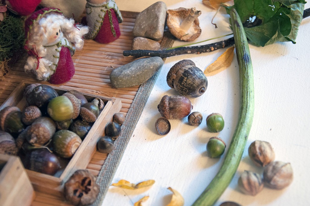 We gather things for our seasonal nature table. Aiden is really good at finding acorns, but not as good at taking them out of his pockets. I’ve been finding them in the washer and dryer all week long.