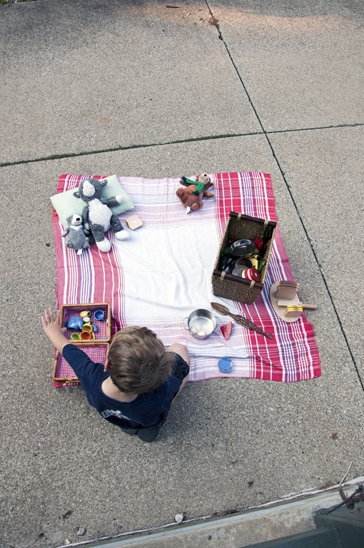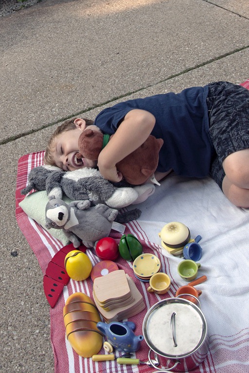 We do a story later on, but most of the rest of the day is Aiden playing. That’s his job, and he’s really good at it. Yesterday was not a school day, but a housekeeping day. Aiden announced that he was taking his animals outside for a picnic.