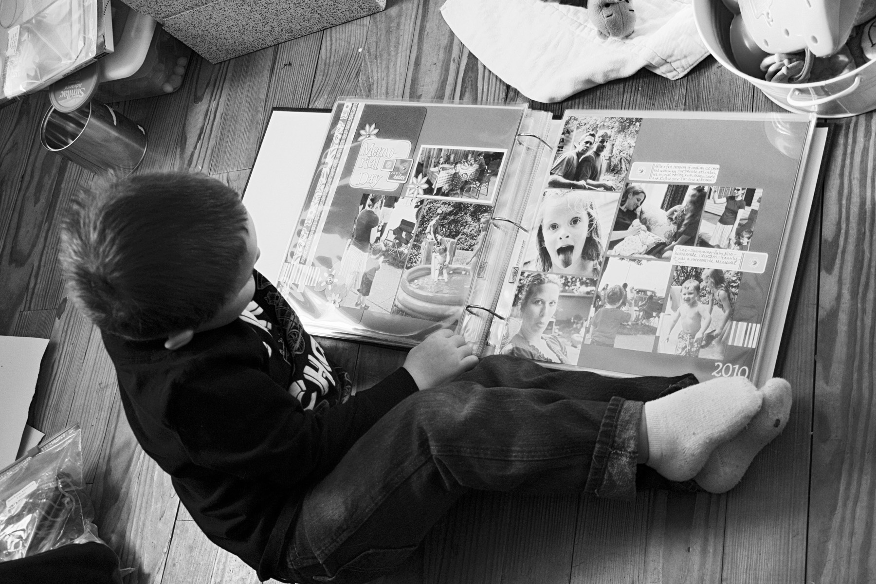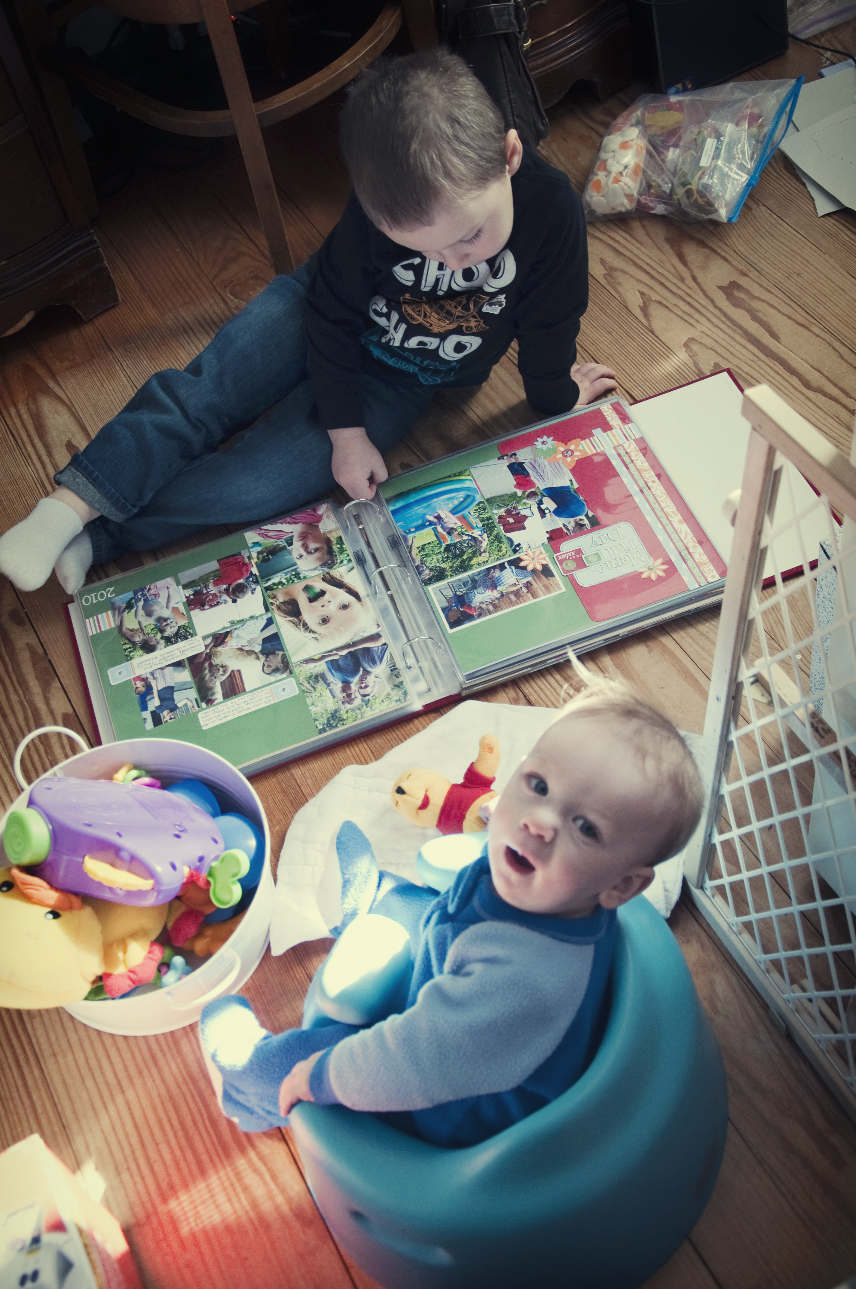 He loves to look through the albums. He sees the layouts and remembers doing this, doing that. He gets upset when he sees a page from before-his-time. “Where was I?” he wants to know. Those explanations get a bit tricky, sometimes. When I think I’m too busy to make a page, I remember how much he loves to see these memories. They cement things in his little mind. He can practice names of people (“This girl and that boy!” he’ll say. “That’s Kylie and Cade,” I’ll remind him. “They’re your cousins!”), and re-live fun things, like the Air Show, the natural history museum, and trips to great places. I look at the albums and marvel at how much he’s grown, though I hardly notice during the everyday grind of life.