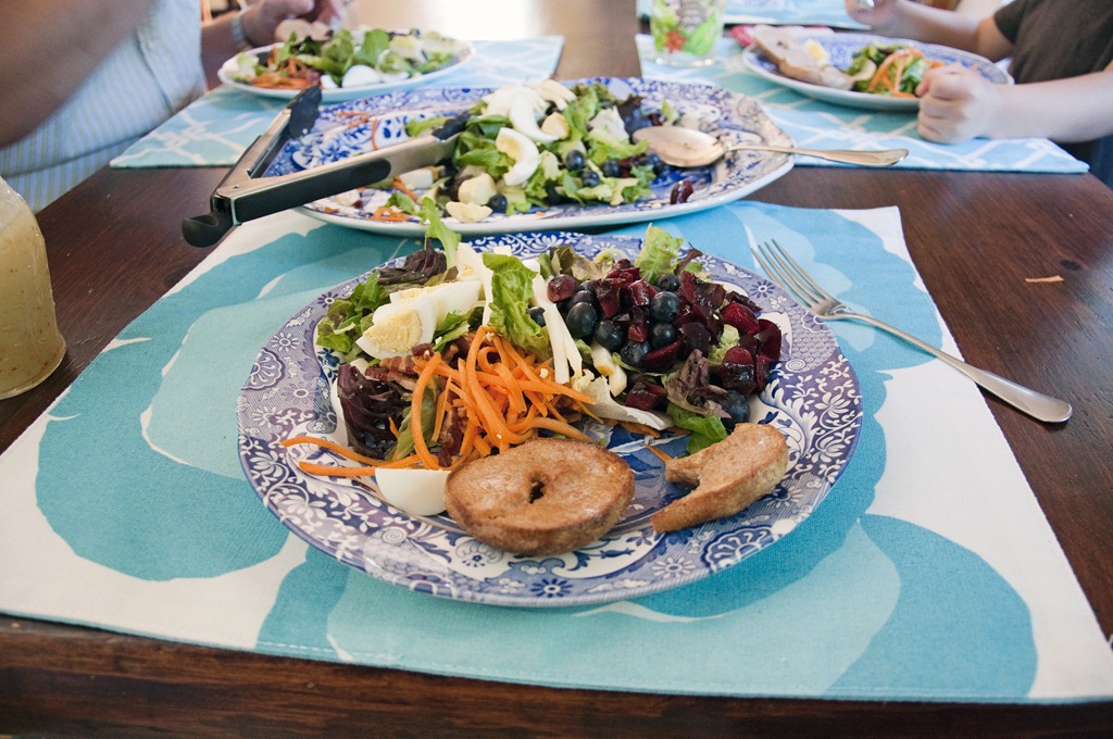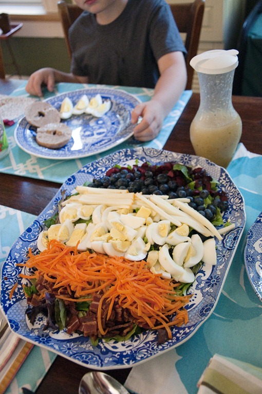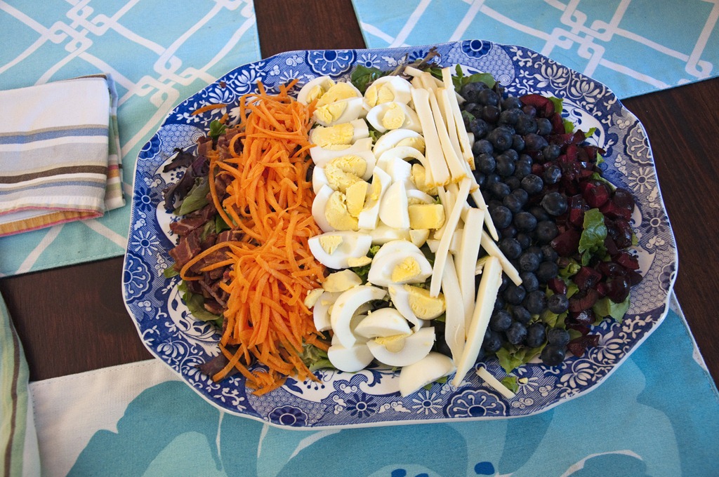 Cherries, blueberries, muenster cheese, carrots, eggs, and bacon on a bed of lovely greens.